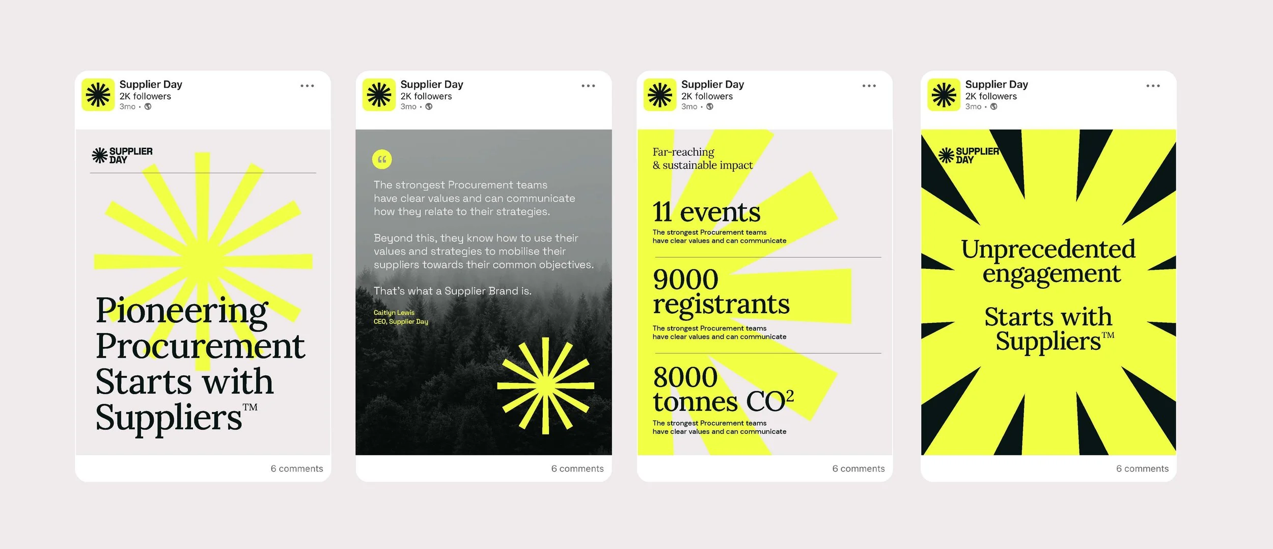 The ‘Unmissable’ brand essence led us to the Supplier Day Spark Mark – an extremely simple and versatile symbol that represents how Supplier Day events are the spark that starts something special. The distinctive yellow hue - undiluted by a wider colour palette - would become unmissable on LinkedIn, and in time recognised as mark of quality, innovation and trust.